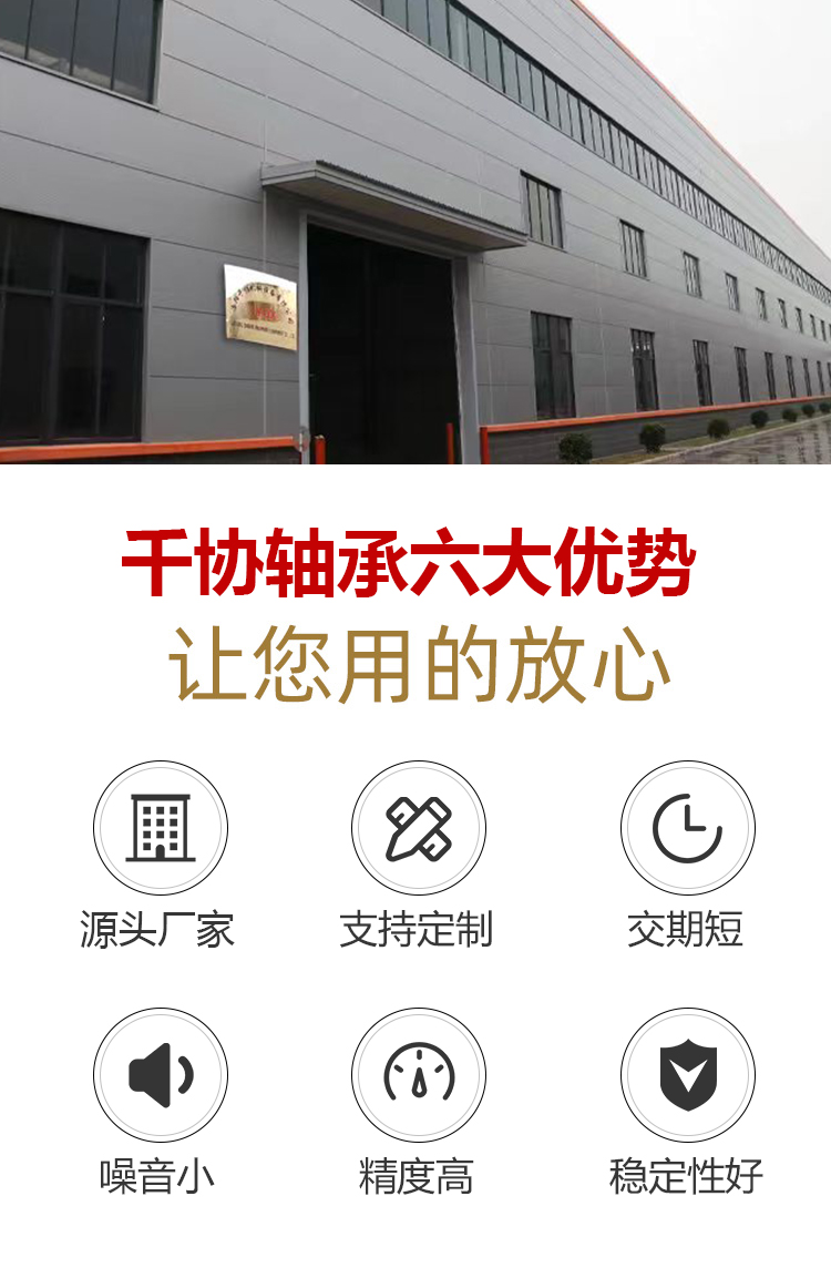 洛陽(yáng)千協(xié)軸承設(shè)備有限公司坐落于中國(guó)重工業(yè)城市—洛陽(yáng),同時(shí)也是有著深厚文化底蘊(yùn)和“軸承之都”的中華名城。集研發(fā)、設(shè)計(jì)、制造及銷(xiāo)售軸承產(chǎn)品為一體的企業(yè),生產(chǎn)設(shè)備多次改進(jìn),砂輪修正器多次改造,檢測(cè)儀器與方法多次完善。科技實(shí)力好、工藝裝備好、檢測(cè)手段完善,可研制、開(kāi)發(fā)、制造精度高、性能好的軸承產(chǎn)品,達(dá)到客戶成本低、能耗少、低故障的運(yùn)行要求。